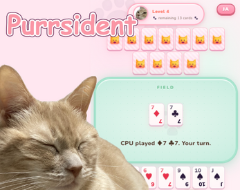 Purrsident is a two-player card game based on Daifugo (Daihinmin), a classic Japanese card game similar to President or Scum.